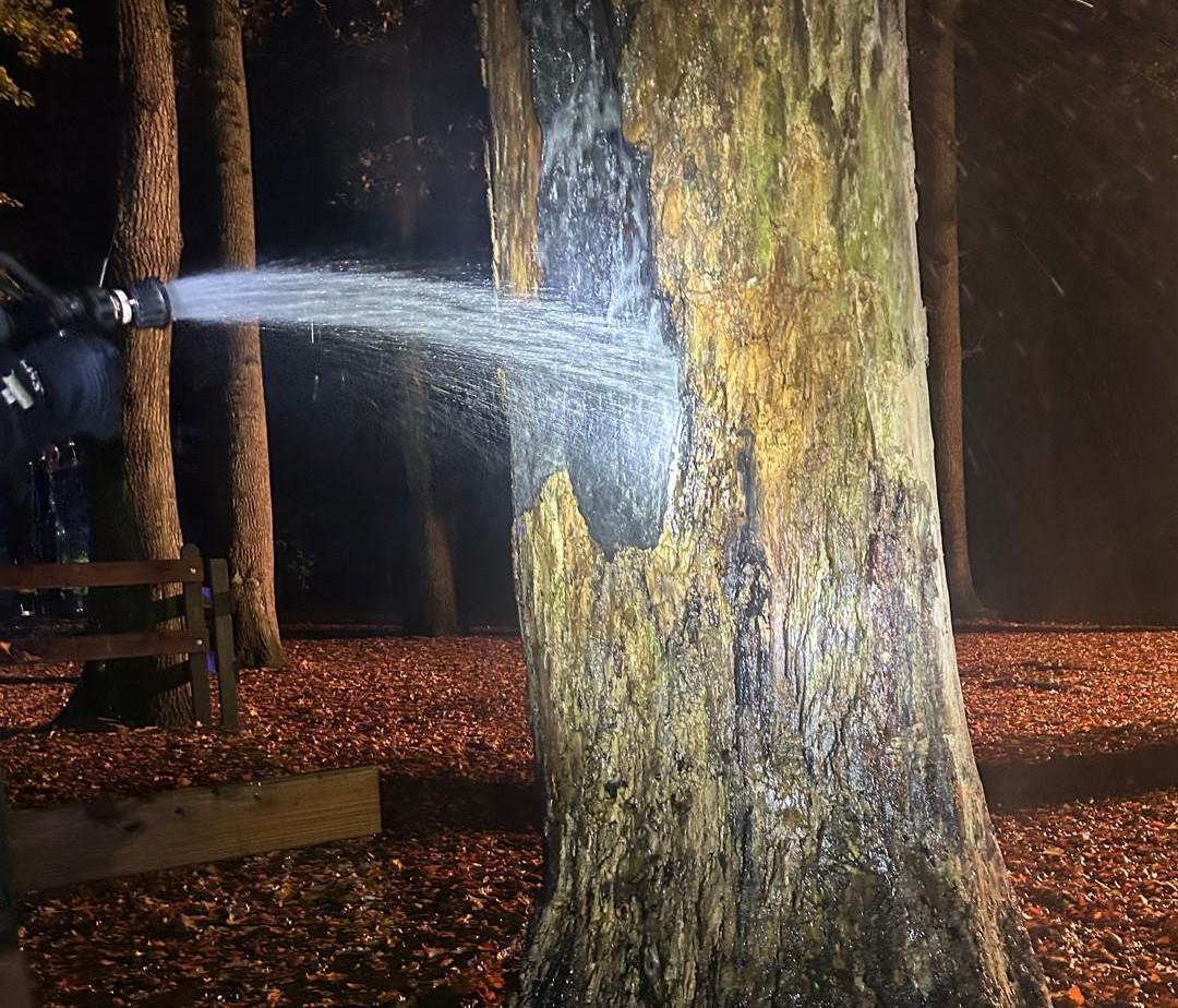 Vor Ort stellten wir einen Brand im Inneren eines Baumes fest. Wir verschafften uns einen geeigneten Zugang und löschten das Feuer mithilfe des Schnellangriffs des HLF 20/16 ab. Anschließend kontrollierten wir den Bereich mit der Wärmebildkamera und stellten nur noch eine geringe Resttemperatur fest.