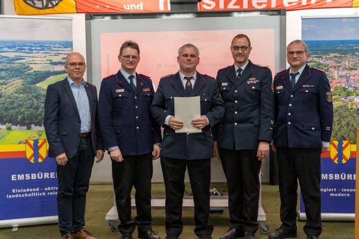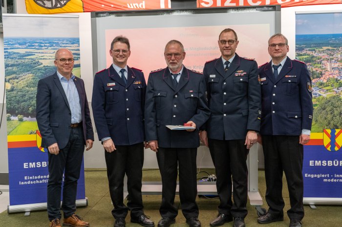 Trotz der hohen Anforderungen besuchten die Einsatzkräfte im Jahr 2023 insgesamt 33 Lehrgänge zur Aus- und Fortbildung. Diese Zahlen verdeutlichen die signifikante Bedeutung des ehrenamtlichen Engagements in Emsbüren. Im Mittelpunkt der Jahresdienstversammlung standen wieder zahlreiche Neuaufnahmen, Wahlen, Beförderungen und Ehrungen. So wurden unter anderem als neue stellvertretende Zugführer Thomas Räkers zum stv. ZF des 1. Zuges und Florian Schulte zum stv. ZF des 2. Zuges für die nächsten drei Jahre ernannt. Weiterhin wurde Tobias Küpers als neuer stv. Gruppenführer der Gruppe 3 ernannt. Um auch stark in der Jugendarbeit vertreten zu sein, übernahm Julian Scheffer das Amt des stv. Gemeindejugendfeuerwehrwartes von seinem Amtsvorgänger Florian Schulte, welcher das Amt nach 9 Jahren aufgrund seiner neuen Funktionen übergibt. Katharina Krüssel ist zudem als stv. Kinderfeuerwehrwartin ernannt worden und übernimmt das Amt von Michael Egbring, welcher als Gründungsmitglied der KF das Amt nach 13 Jahren übergibt. Als dienstältestes Mitglied der Freiwilligen Feuerwehr Emsbüren in der Alters- und Ehrenabteilung erhielt Paul Arning eine besondere Ehrung zu 75 Jahren Mitgliedschaft.
