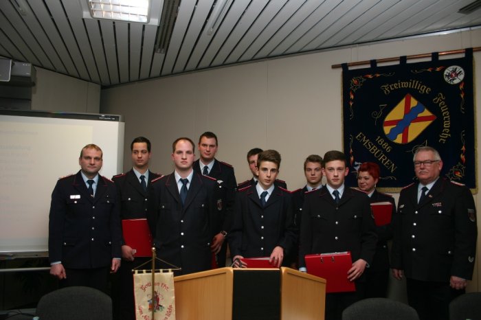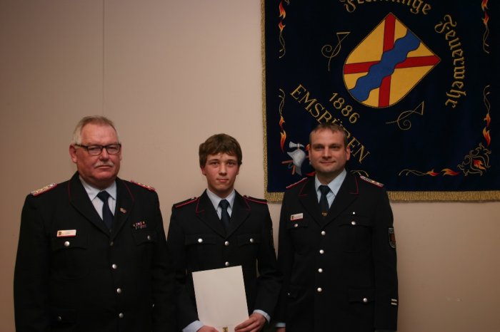 Ebenso abwechslungsreich und spannend war das vergangene Jahr für die Jugendfeuerwehr, dies stellte Gemeindejugendfeuerwehrwart Björn Schüer in seinem Bericht fest. Neben 75 Stunden für feuerwehrtechnische Ausbildung und 60 Stunden allgemeine Jugendarbeit wurden 18 Tage für Fahrten und Lager absolviert. Die Dienstbeteiligung lag bei nahezu 90 %, freute sich Schüer. Das Jahr begann mit der traditionellen Tannenbaumaktion. Beim Völkerballturnier in Baccum belegte die Jugendfeuerwehr Emsbüren den 1. Platz. Die Wettbewerbe mussten aufgrund eines Unwetters leider abgesagt werden. Highlight des Jahres war jedoch wieder das große Zeltlager, welches im vergangenen Jahr in Lingen-Bramsche stattfand. Bei wechselhaftem Wetter hatten alle Beteiligten großen Spaß. In diesem Zusammenhang kündigte Schüer an, dass das Zeltlager in diesem Jahr in Emsbüren stattfinden werde. Er schilderte den großen logistischen Aufwand, die die Organisation des Zeltlagers mit sich bringe. Er rechne mit rund 360 Teilnehmerinnen und Teilnehmern. Ein großer Dank gelte jedoch seinem engagierten Betreuerteam und seinen Stellvertretern, ohne deren Hilfe die Jugendarbeit nicht zu bewältigen wäre. Weiterhin dankte er dem Kommando und der Gemeindeverwaltung.