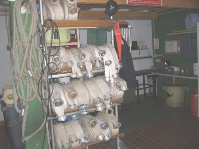 Im Flur des Hauptgebäudes befinden sich die Haken mit den Einsatzklamotten. |